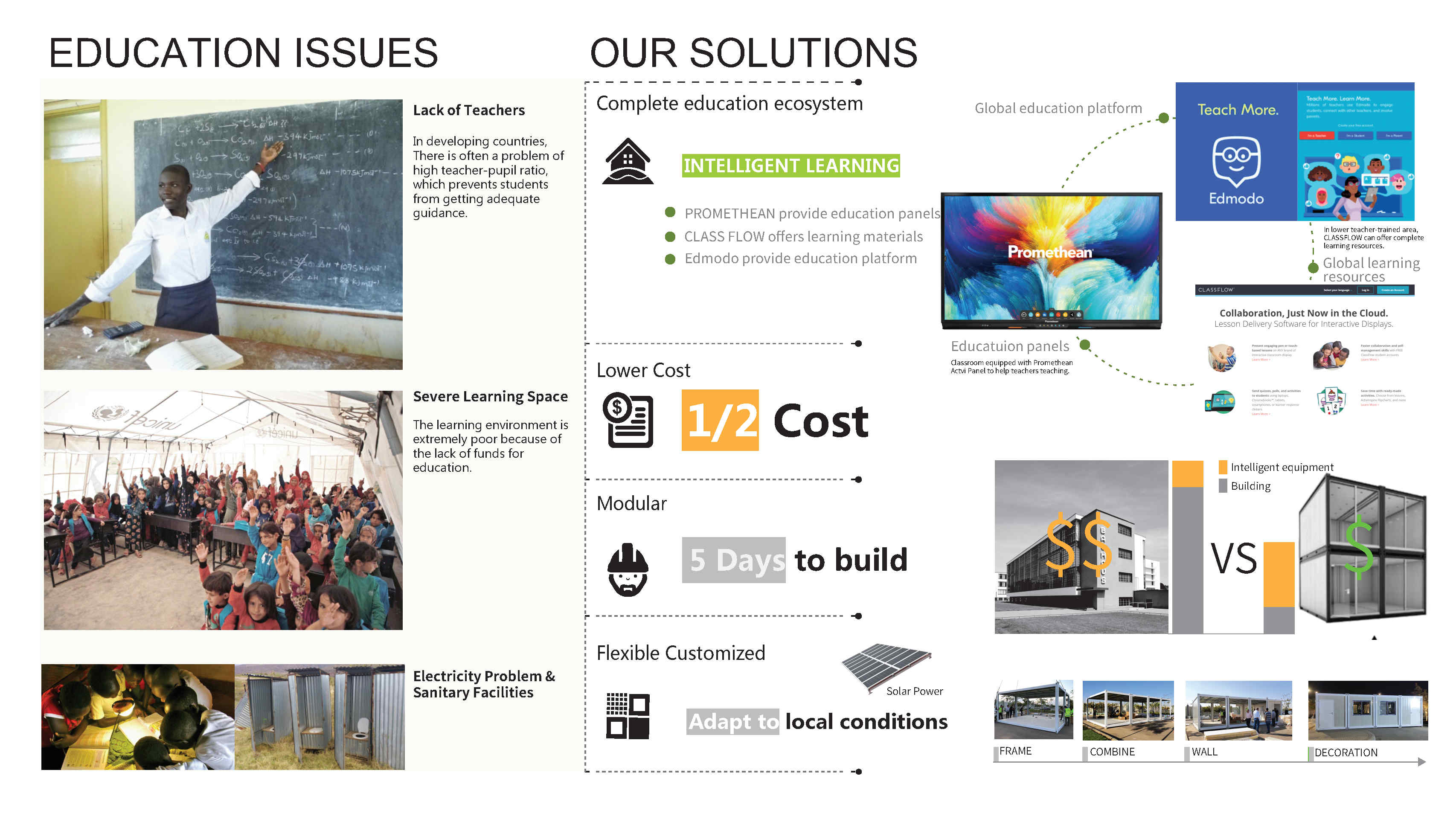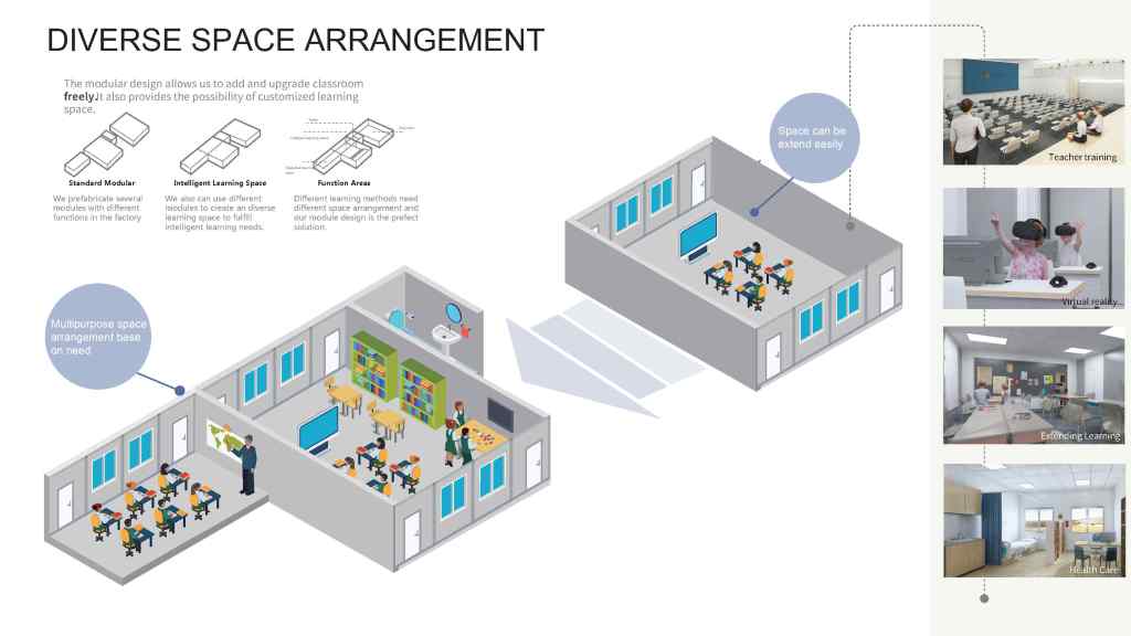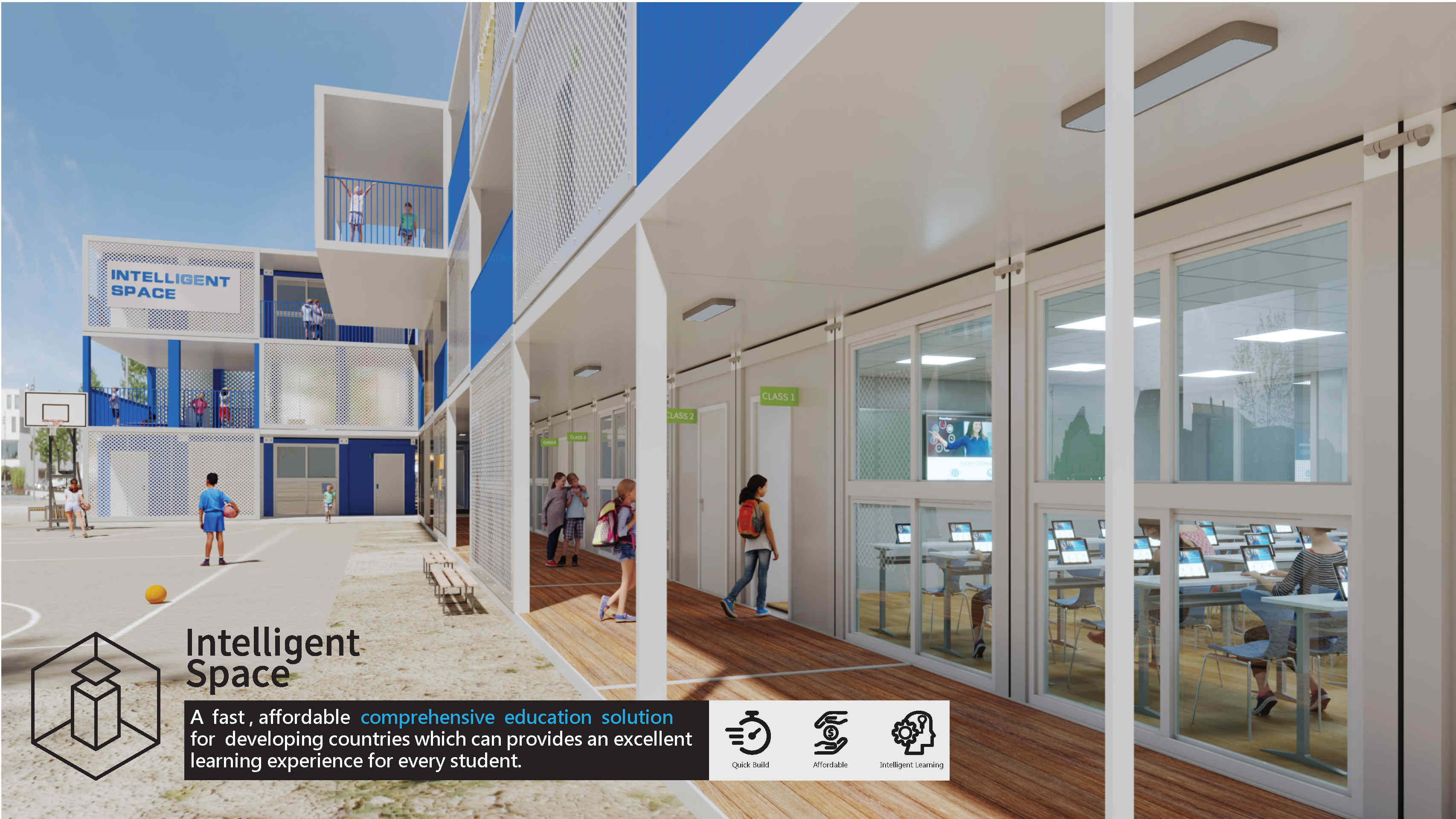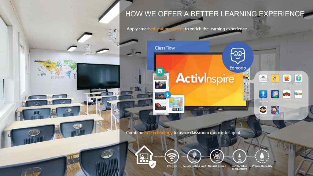In the face of an unfair education situation, our Intelligent Space offers a fast, affordable, comprehensive education solution for developing countries. It can provide an excellent learning experience for every child, enabling us to achieve the goal of education equality. Compared with the traditional building methods, Intelligent Space school buildings are set up using prefabricated structures. Intelligent Space schools can deploy and install quickly. By configuring interactive whiteboards and smart devices into our classrooms, children in these countries also can enjoy the benefits of intelligent learning and have a better learning experience and outcome.